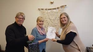 Ruoveden Teatterin puheenjohtaja Hanna Kallionpää ojentaa Ninalle diplomin ja sihteeri Tom Söderholm teatterin lahjan.
