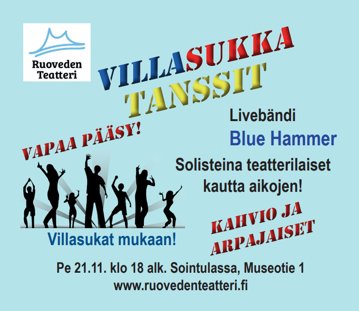 Varaukset teatteri(at)ruovedenteatteri.fi tai Anne Hackman 040 773 4308 tai Irina irinatuomainen( at)hotmail.com