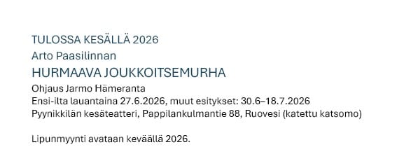Ohjelmisto Aiempia näytelmiä kuvagalleriassa Tervetuloa nauttimaan tunnelmallisesta Pyynikkilän teatterimiljööstä!